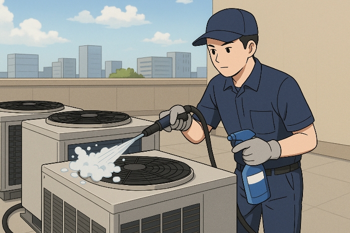 정기적으로 실외기 외부 열교환기를 전용 세척약품과 고압분사기를 이용해 청소합니다.
